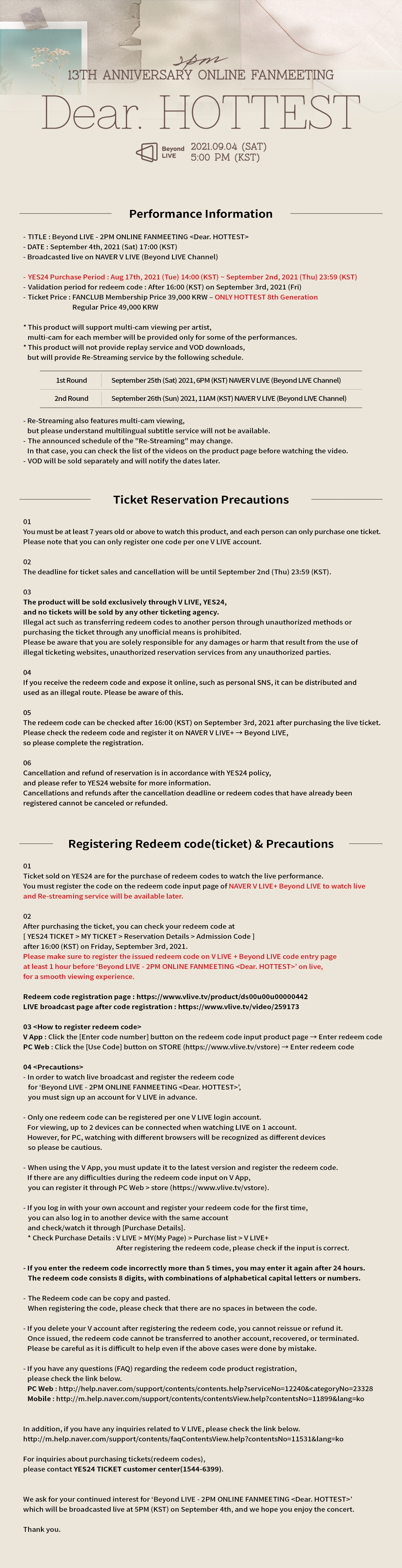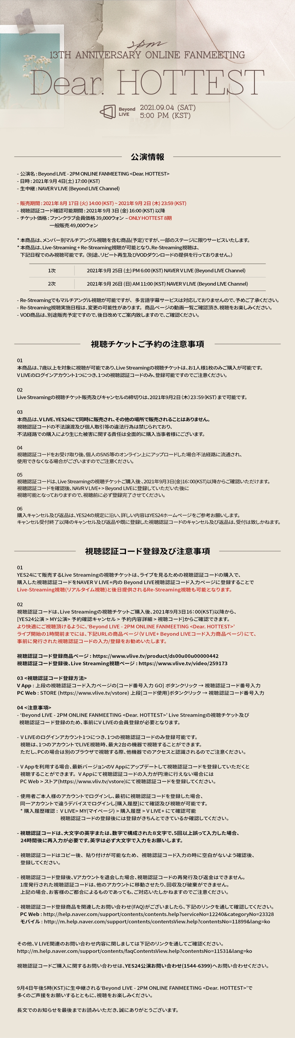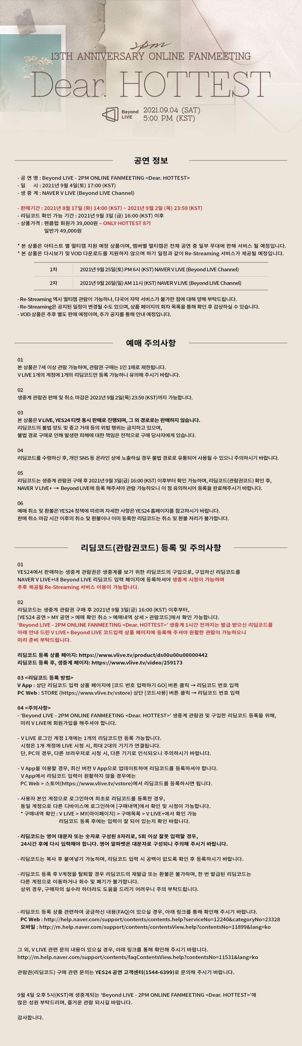 Beyond LIVE - 2PM ONLINE FANMEETING <Dear. HOTTEST> 예매 상세 안내/TICKET DETAIL NOTICE (KR/EN/JP)